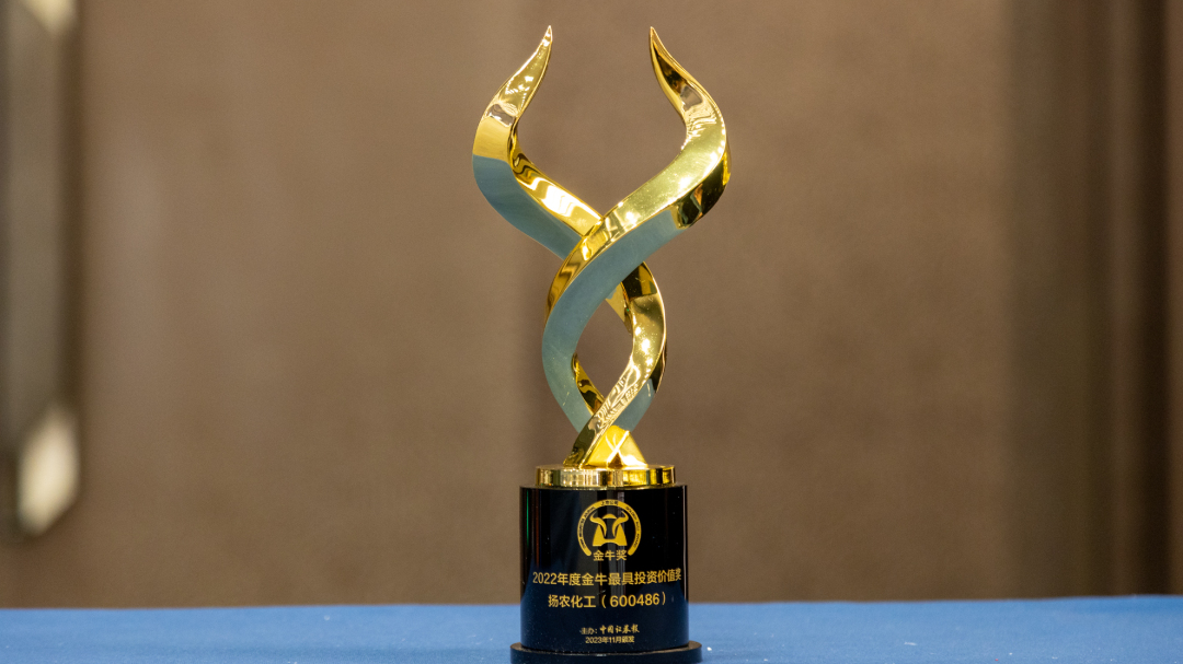 11月23日,由中国证券报、南通市人民政府主办的“2023中国上市公司高质量发展论坛暨第二十五届上市公司金牛奖颁奖典礼”在南通举行。扬农化工凭借在农化行业深厚的客户基础与品牌口碑、一体化的研产销能力以及超越合规的绿色发展能力,荣获2022年度“金牛最具投资价值奖”,公司董事会秘书陆东升上台领奖。