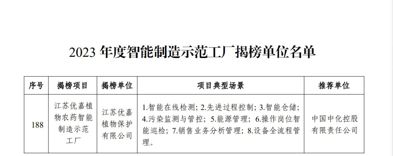 近日,国家工业和信息化部、国家发展改革委、财政部、国务院国资委、市场监管总局五部门联合发布2023年度智能制造示范工厂名单,子公司优嘉植保荣膺榜单。