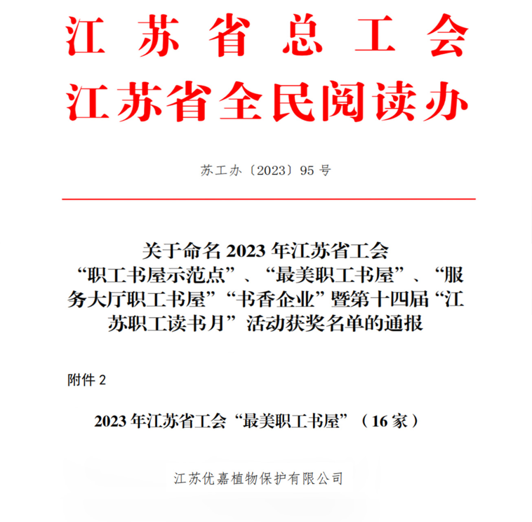 12月18日,江苏省总工会、江苏省全民阅读办联合印发通报,授予全省16家单位“2023年江苏省工会‘最美职工书屋’”称号,子公司优嘉植保获得该项荣誉。