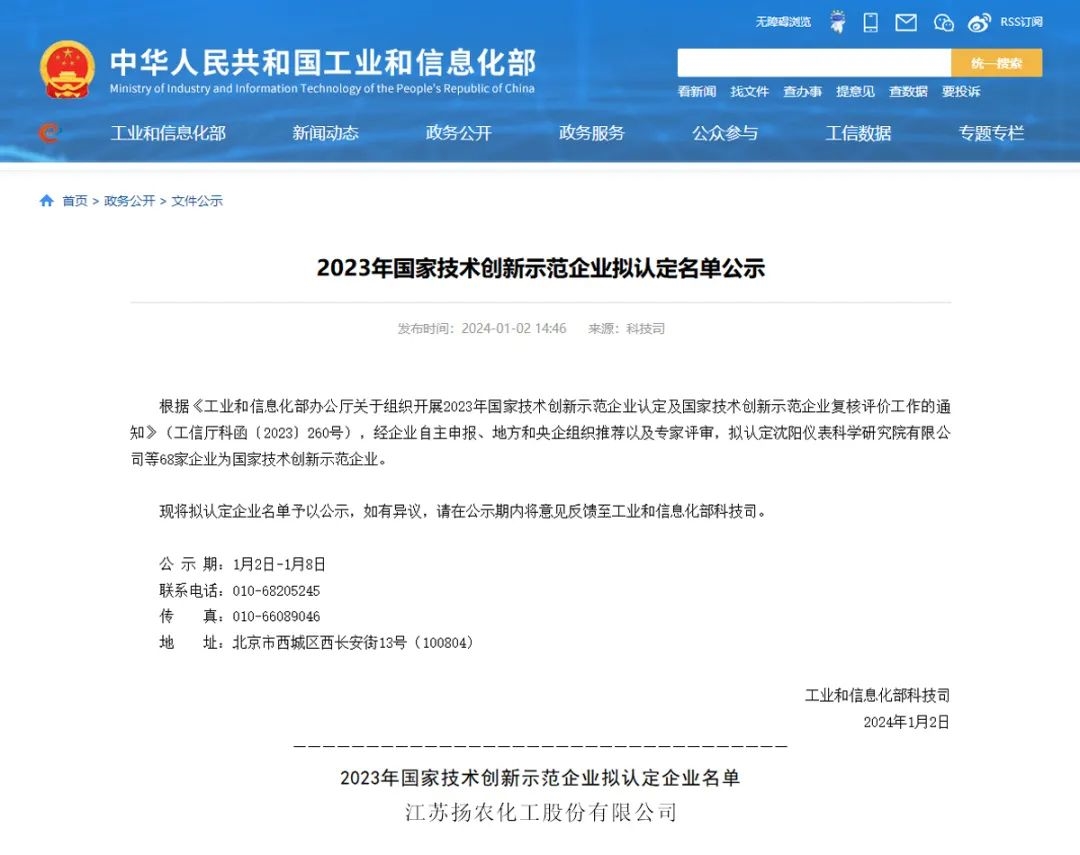 1月2日,工业和信息化部发布2023年国家技术创新示范企业拟认定公示名单,扬农化工荣膺榜单。