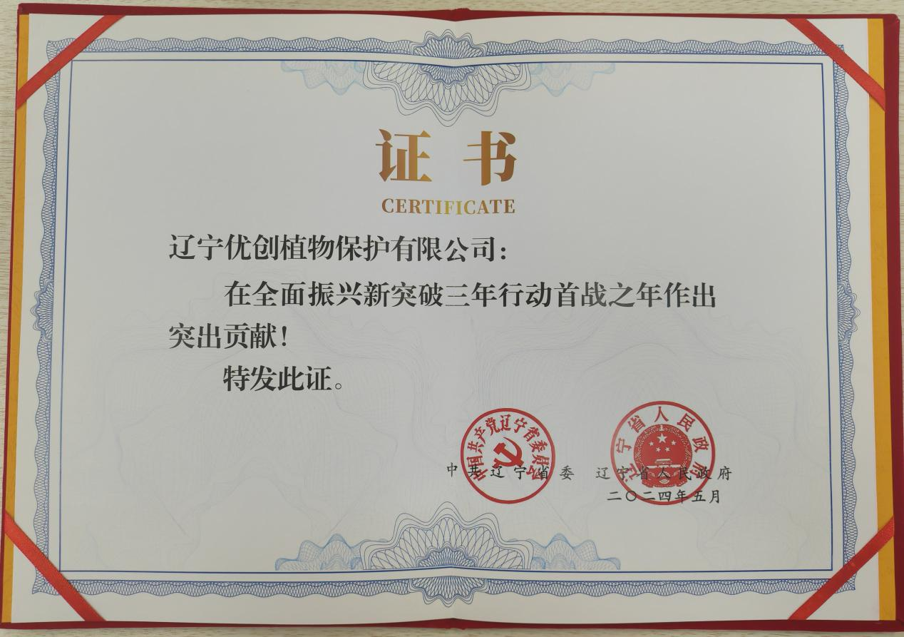 会议对在全面振兴新突破三年行动首战之年作出突出贡献的企业予以通报表扬,我司子公司辽宁优创植物保护有限公司荣膺榜单!