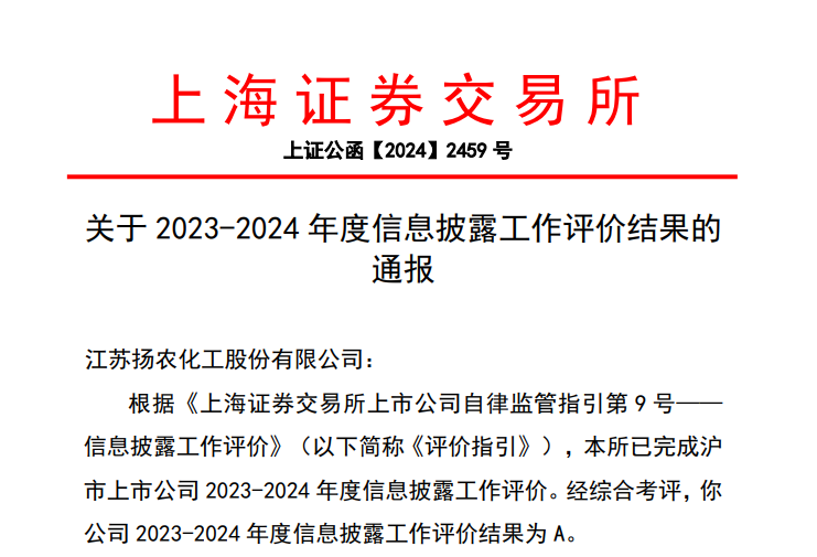近日,上海证券交易所公布2023-2024年度信息披露工作评价结果,扬农化工再次获得最高评级A级。截至目前,公司已连续十年获得A级评价,充分体现了监管机构对公司在治理运作规范、信息披露质量、投资者关系管理等方面的高度认可。