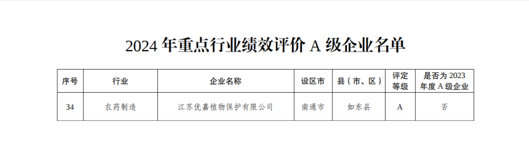 近日,江苏省生态环境厅对2024年度重污染天气重点行业绩效评价A级、引领性和B(含B-)级企业名单进行公示,扬农股份子公司优嘉植保上榜获评A级企业。这一荣誉是环保绩效评级的最高等级,代表同行业环保治理最好水平,不仅是对公司在环保方面不懈努力的认可,也是对公司积极践行习近平生态文明思想、坚持精准治污、科学治污、依法治污策略的具体体现。