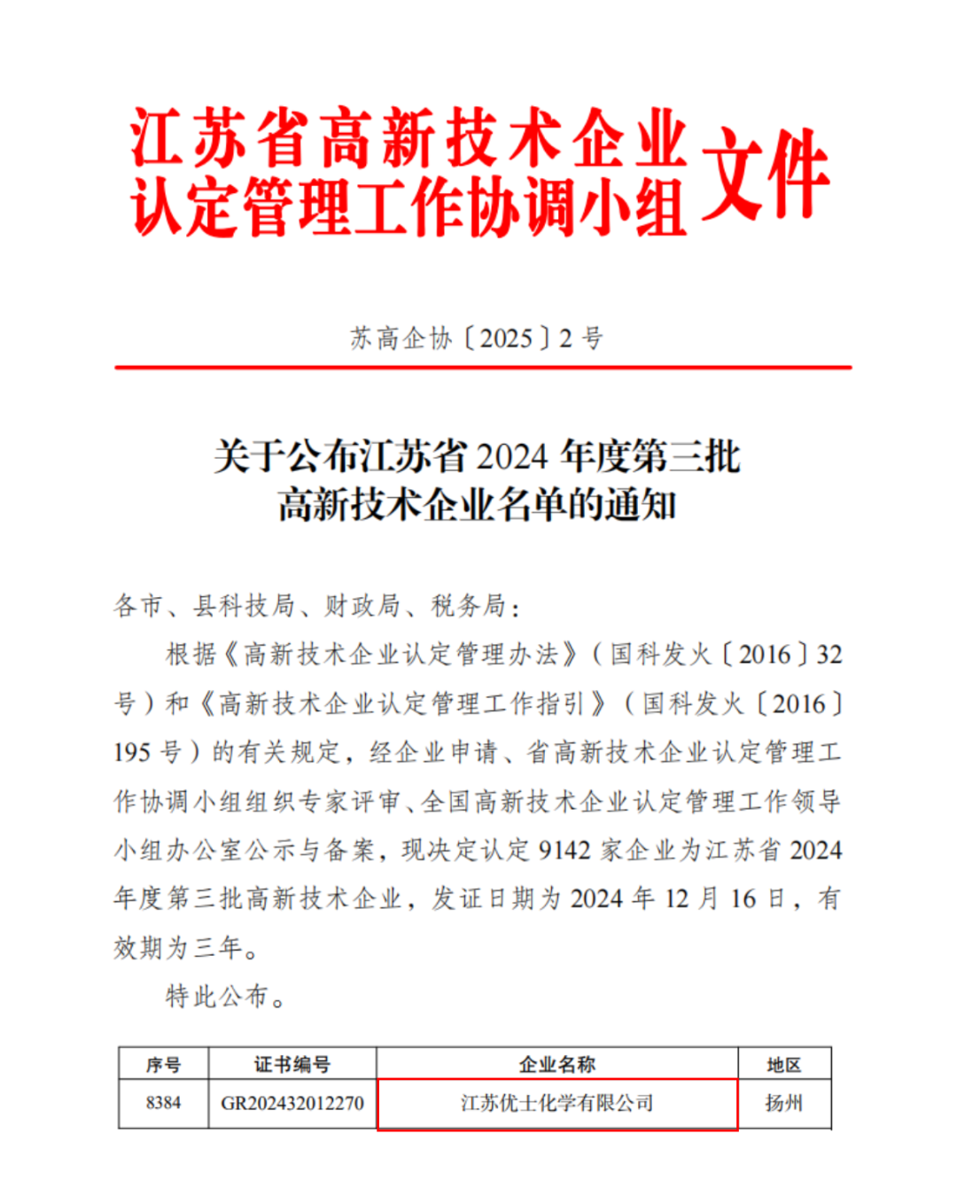 近日,江苏省科技厅公布《江苏省2024年度第三批高新技术企业名单》,我司子公司优士化学顺利通过高新技术企业复评。