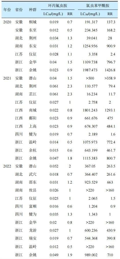 表1  2020—2023年环丙氟虫胺和氯虫苯甲酰胺对不同地区二化螟种群的RR值