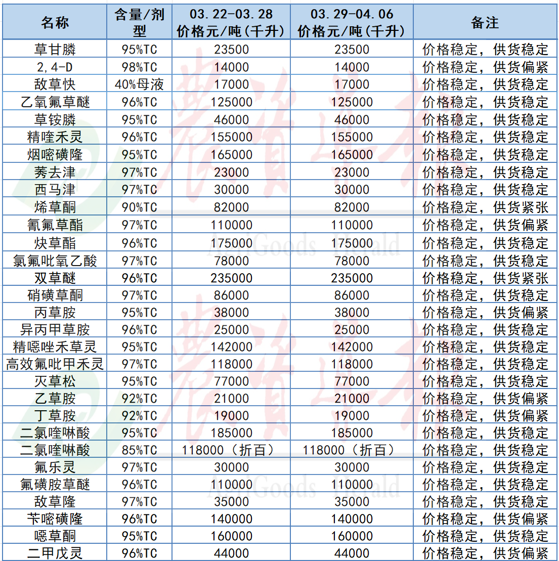 上周(3月29日至4月6日),农药整体需求保持相对稳定,交投持续向好。大部分产品价格波动不大,稳定为主;部分产品因上游开工情况及需求影响,价格维持上调的态势;也有部分产品价格一直处于低位盘整,随着市场需求的启动以及上游产能未得到释放,上游厂家有意向上调价格,产品价格出现反弹迹象,上调品种或者供货紧张的品种相比上上周有所增加。当前,厂家维持较低开工率,整体库存量处于低位,使得产品价格基本保持坚挺或有上调的空间。